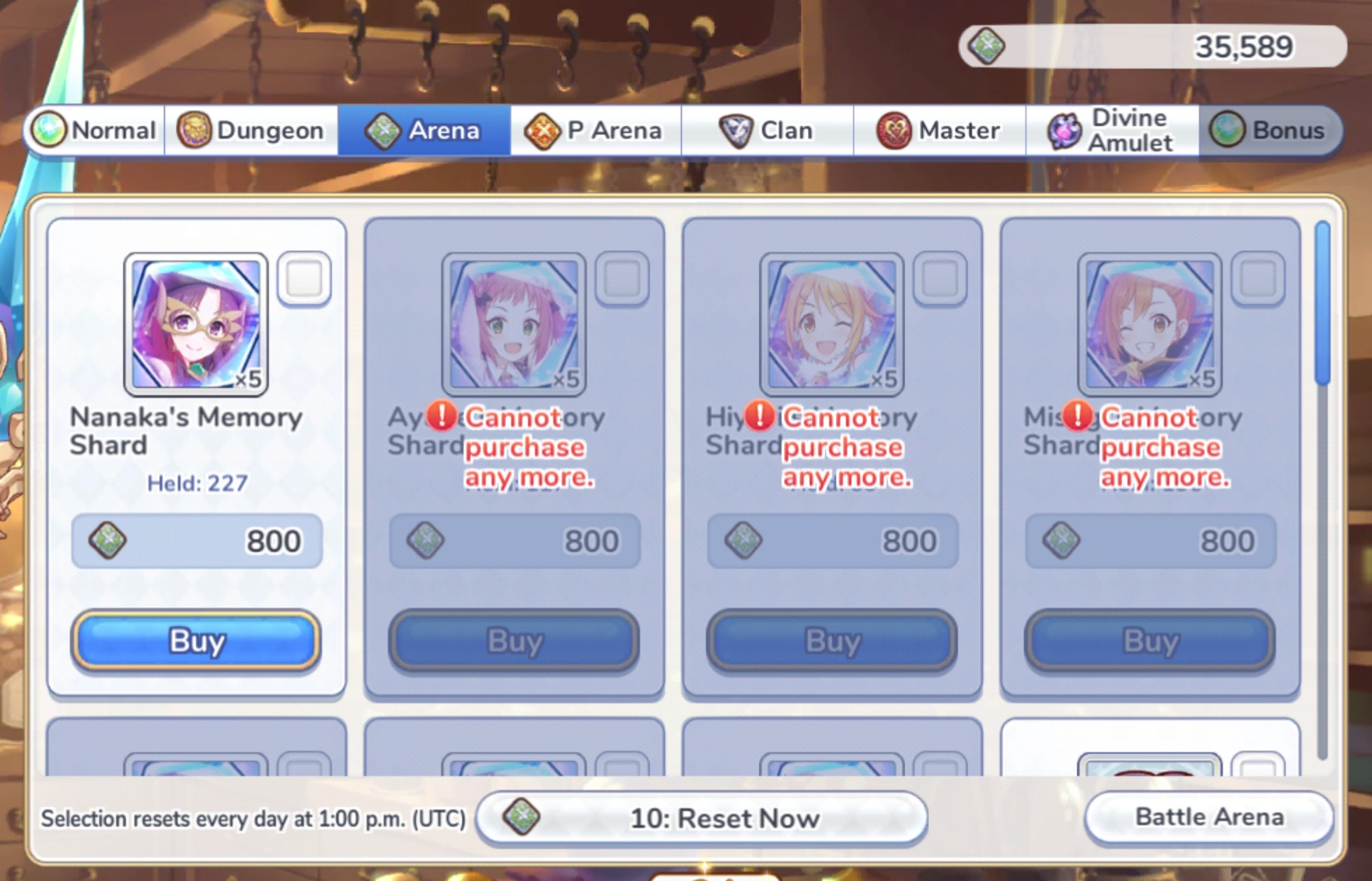 Arena Shop is a Shop in Princess Connect! Re:Dive where players can spend Arena Coins earned from the Battle Arena to purchase Memory Shards and Equipment.