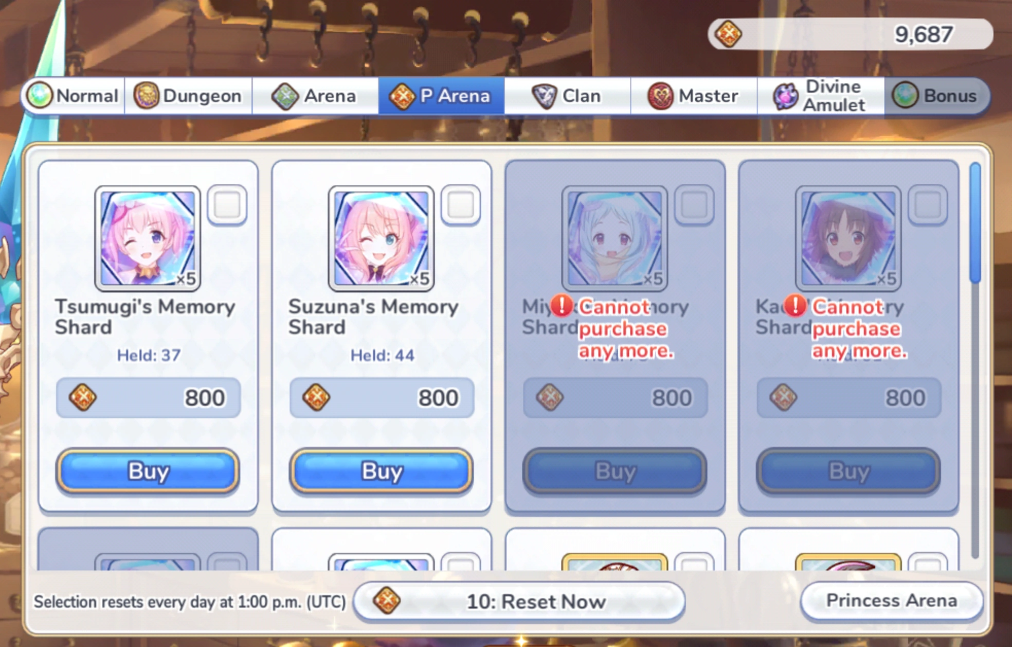 Princess Arena Shop is a Shop in Princess Connect! Re:Dive where players can spend Princess Arena Coins earned from the Princess Arena to purchase Memory Shards and Equipment.